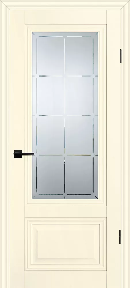 Царговое полотно, выполненное в гладком матовом покрытии, приятным на ощупь, обладающее высокими эксплуатационными характеристиками. Безопасный для здоровья и практичный материал. Бескромочная технология. Сборно-разборная конструкция.###-line-###Полотно комплектуется фигурным багетом и объемной филенкой.